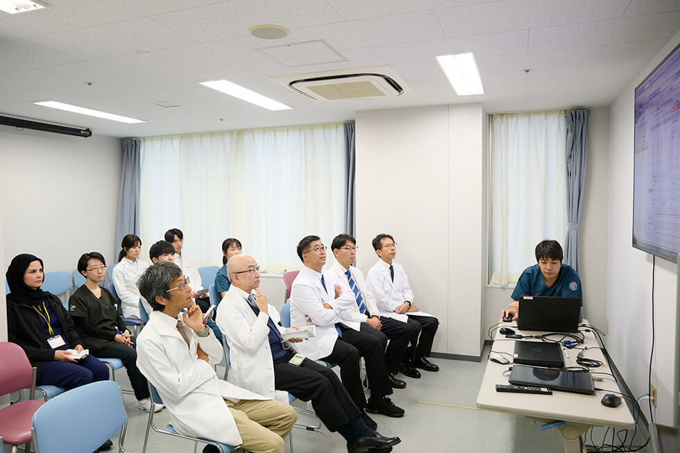 8時30分に集合で1日が始まります。週2回の脳卒中センター合同カンファレンスがありますが、他の日も診療科内で毎朝症例検討しています(こちらに示す写真はその風景です)。